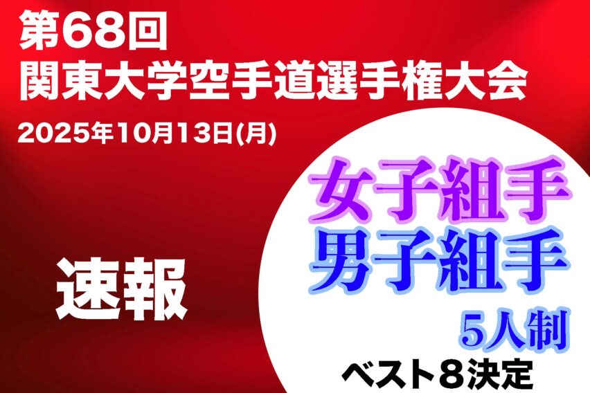 大会結果 【速報!】ベスト8!「女子・男子団体組手」 第68回関東大学空手道選手権大会 ★「勝ち上がり速報」が見れます!LIVE配信もあります!「第68回関東大学空手道選手権大会」が、10月13日に日本武道館にて開催。午後 女子・男子団体組手 競技の速報。 2025年10月13日 大会結果