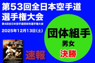 「内閣総理大臣杯/天皇盃 皇后盃 第53回全日本空手道選手権大会・第4回全日本空手道団体形選手権大会」が、12月13日(土)東京武道館(東京都足立区)にて開催。午後 団体組手競技の速報。
