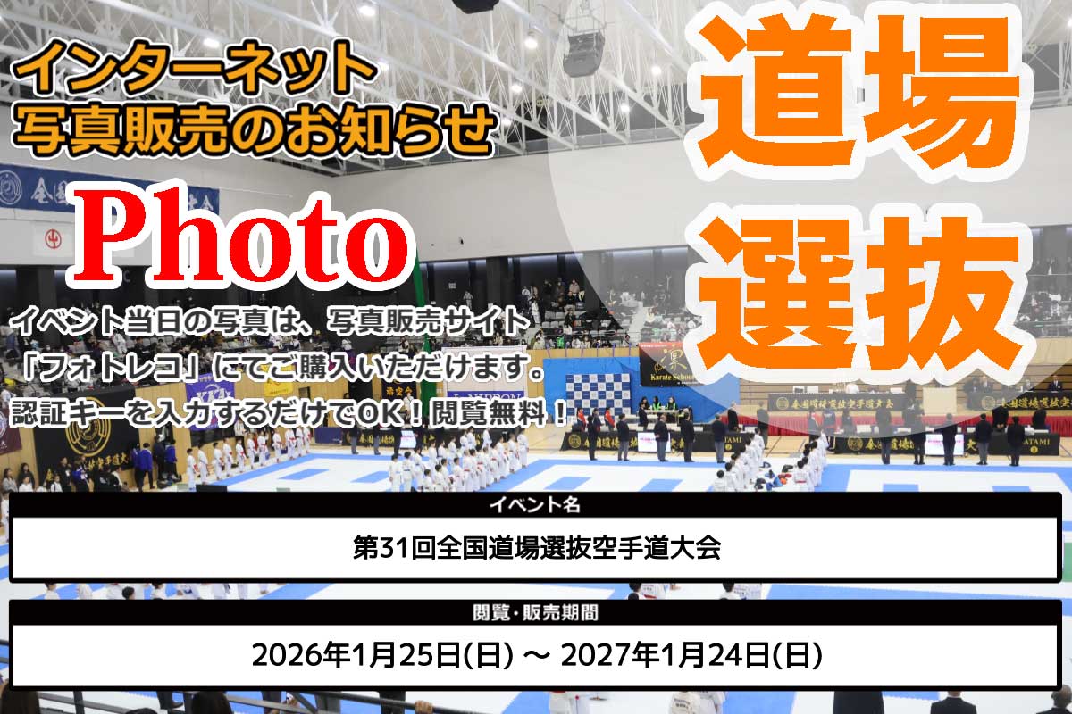 ★写真を近日公開★1月24日、「第31回全国道場選抜空手道大会」がキッコーマンアリーナ(流山市民総合体育館)で開幕した。国内屈指の伝統と規模を誇るオープン大会で、今回は延べ約2000名と過去最多を更新。1月24日、25日の2日間で、会場に1...