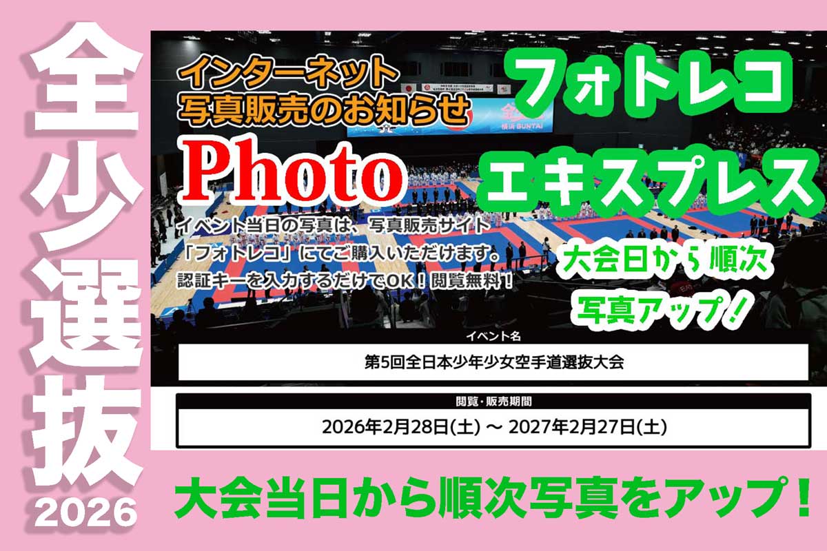 ★全少選抜2026 大会当日28日から、「フォトレコ」サイトに大会写真を順次アップしていきます!2月27日(金)〜3月1日(日)の3日間、横浜武道館で開催される「第5回全日本少年少女空手道選抜大会」"全少選抜"にて、JKFanでは、写真販売...