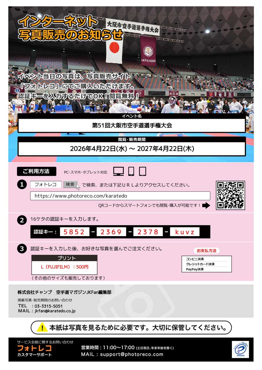 【写真販売のご案内】第51回大阪市空手道選手権大会 4/22(水)より