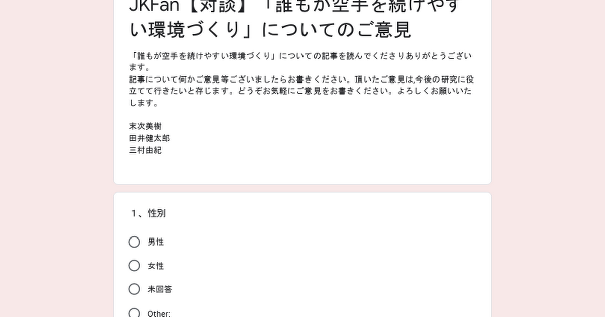 「誰もが空手を続けやすい環境づくり」についての記事を読んでくださりありがとうございます。記事について何かご意見等ございましたらお書きください。頂いたご意見は,今後の研究に役立てて行きたいと存じます。どうぞお気軽にご意見をお書きください。よろ...