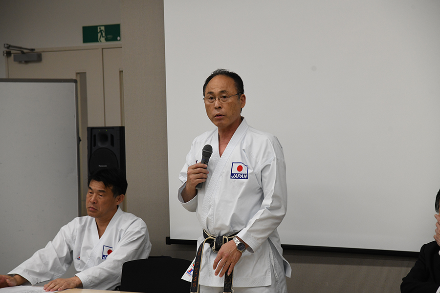 ミズノスポーツ振興財団・水野英人副会長より全日本空手道連盟・栗原茂夫副会長に助成金が授与された。
