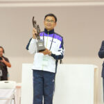 - 表彰式で授与された総 合優勝トロフィーを掲げる東京都の横道監督