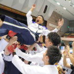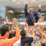 - 胴上げされた男子キャプテン芝本航矢