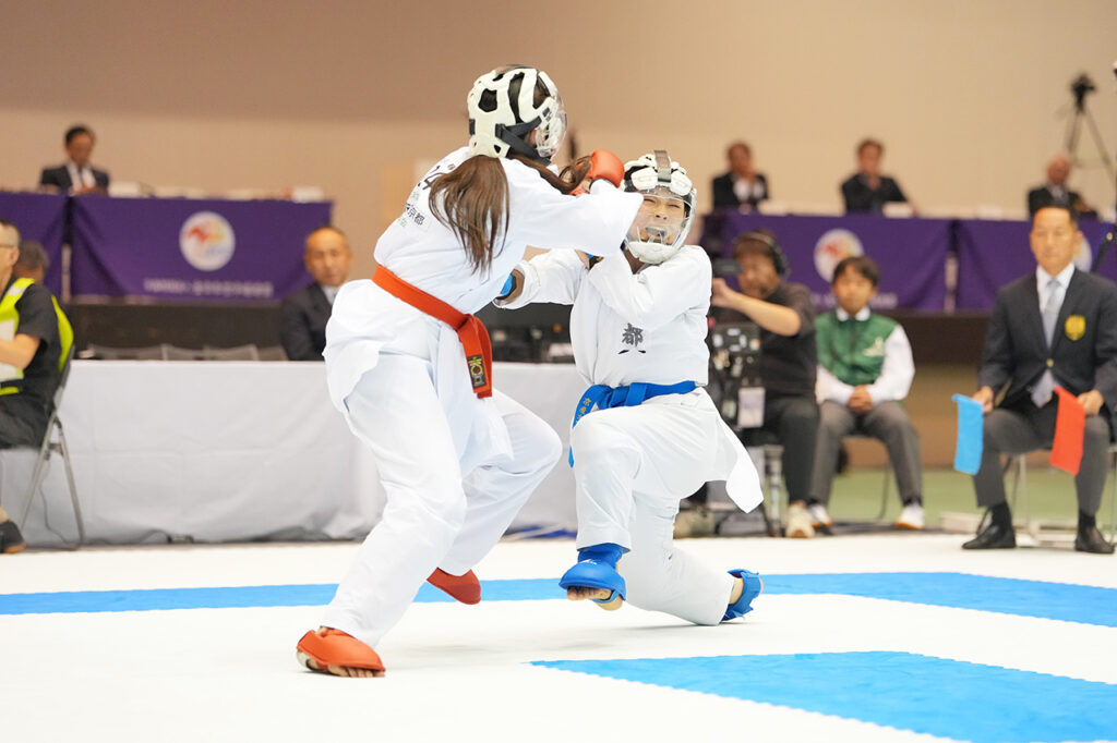 組手団体戦決勝次鋒戦、中段突きを決めた京都の武田桜花