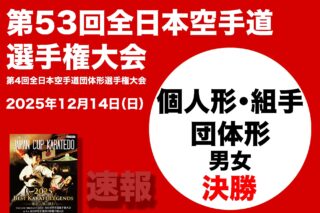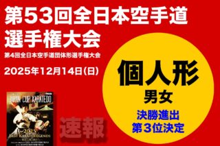 12月14日(日)、日本武道館(東京都千代田区)にて開催された「天皇盃 皇后盃 内閣総理大臣杯 第53回全日本空手道選手権大会・第4回全日本空手道団体形選手権大会」の大会2日目。第4回全日本空手道団体形選手権大会の決勝が行われた。