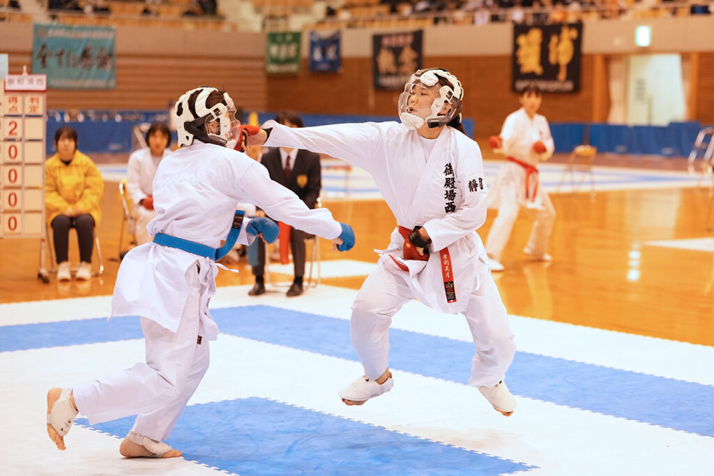 女子団体組手決勝、先鋒戦で上段突きを決めた御殿場西の片岡美月
