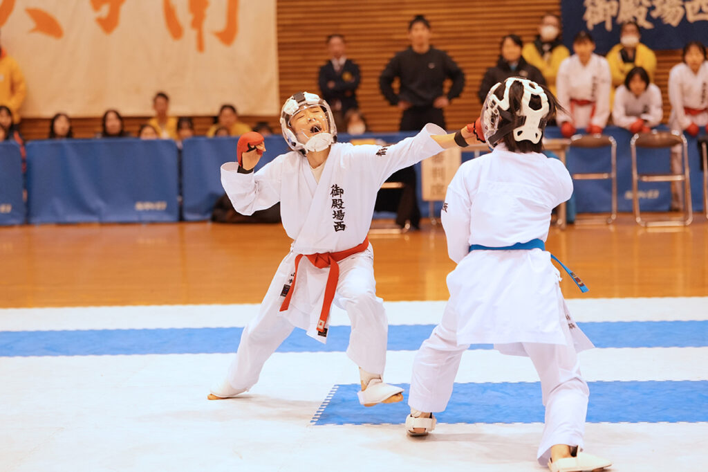 女子団体組手決勝、先鋒戦で上段突きを決めた御殿場西の片岡美月