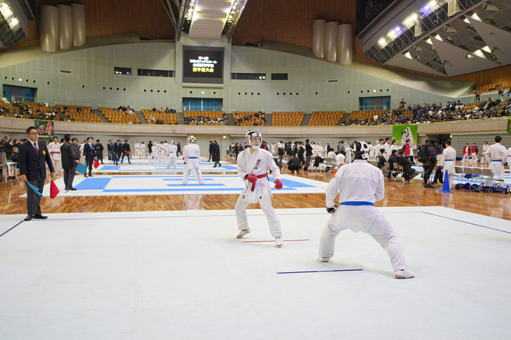 男子団体決勝の先鋒戦で上段突きを決めた京都外大西Aの飯島楓斗