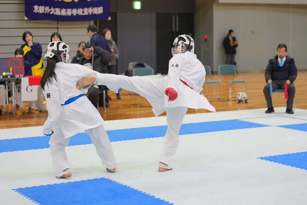 女子団体決勝の副将戦で中段蹴りを決めた城南学園の川原田陽和