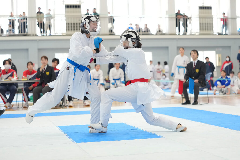 男子団体組手決勝で中段突きを決めた世田谷学園の副将・渡部秀乃介