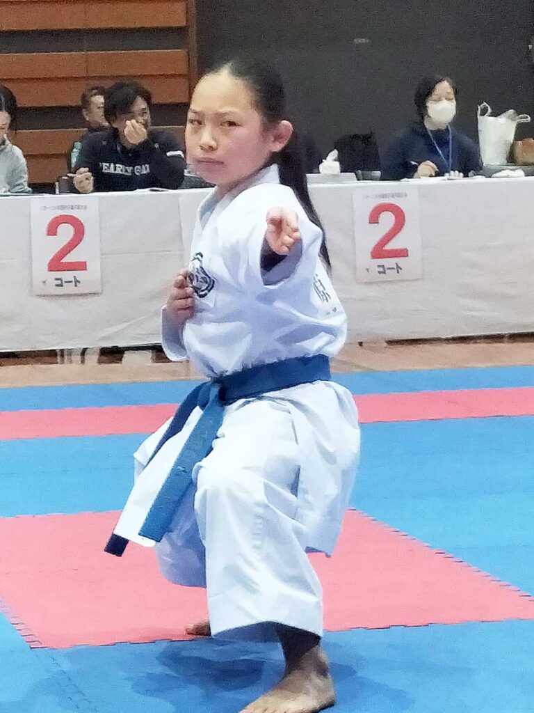 組手-小学生1年生女子の部-優勝の岡本莉子選手(青)
