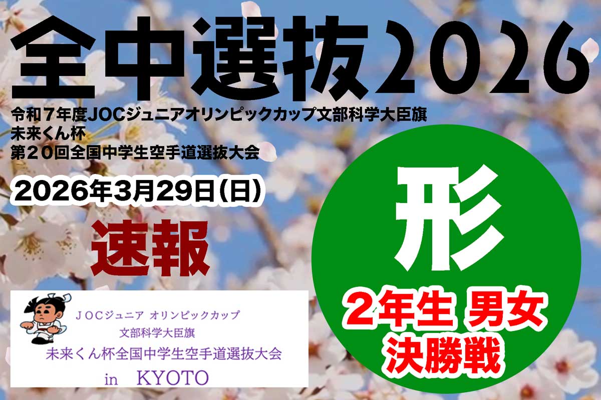 3月28日(土)~29日(日)に京都府亀岡市の亀岡運動公園体育館で「JOCジュニアオリンピックカップ文部科学大臣旗 未来くん杯 第20回全国中学生空手道選抜大会」が開催されている。