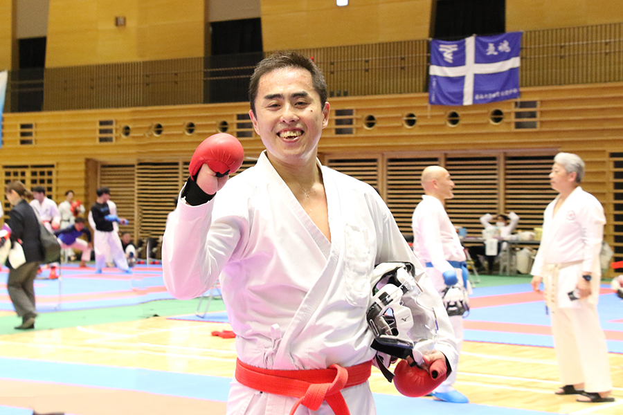 シニア男子40歳以上組手優勝の丸毛博之選手(國學院大學紫魂会)