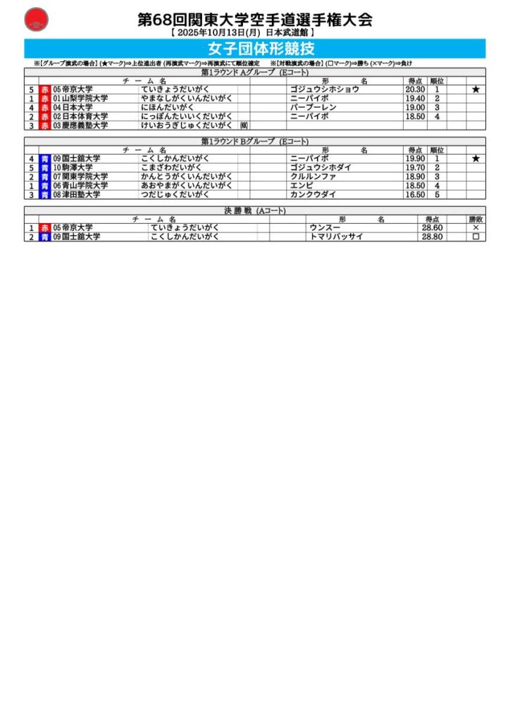 第68回関東大学空手道選手権大会 結果