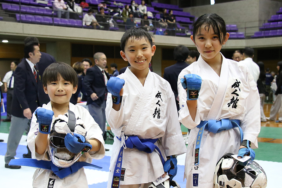小学生団体形(4~6年生)優勝の成人館(川上駆選手、瀬口美玲選手、樫村心渚選手)