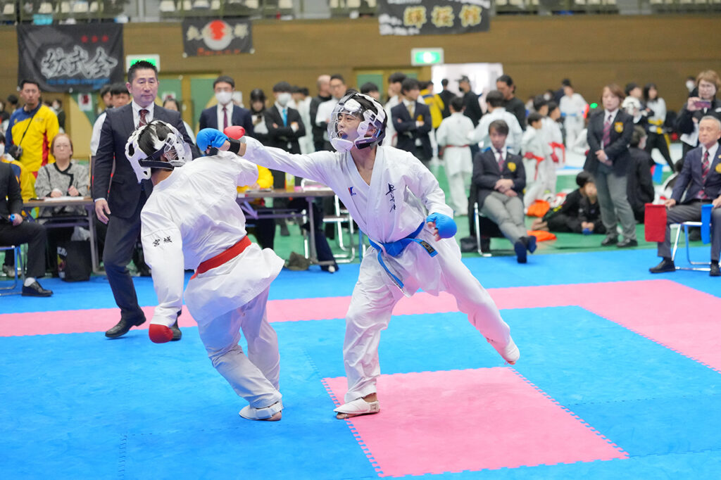 中学生男子団体決勝で上段突きを決めた昇道館Aの石井嵐丈