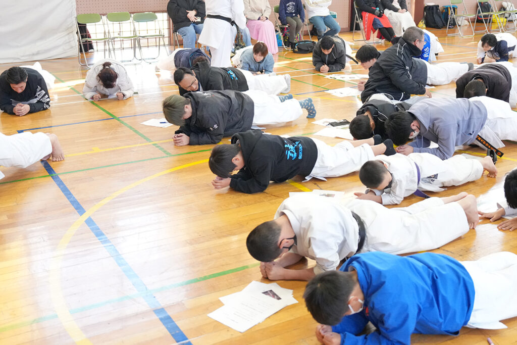 セミナーに参加した皆さん。会場のあきる野市屋城小学校体育館には、全少からマスターズまでの全国大会での優勝・入賞者など各地から51名の参加がありました。