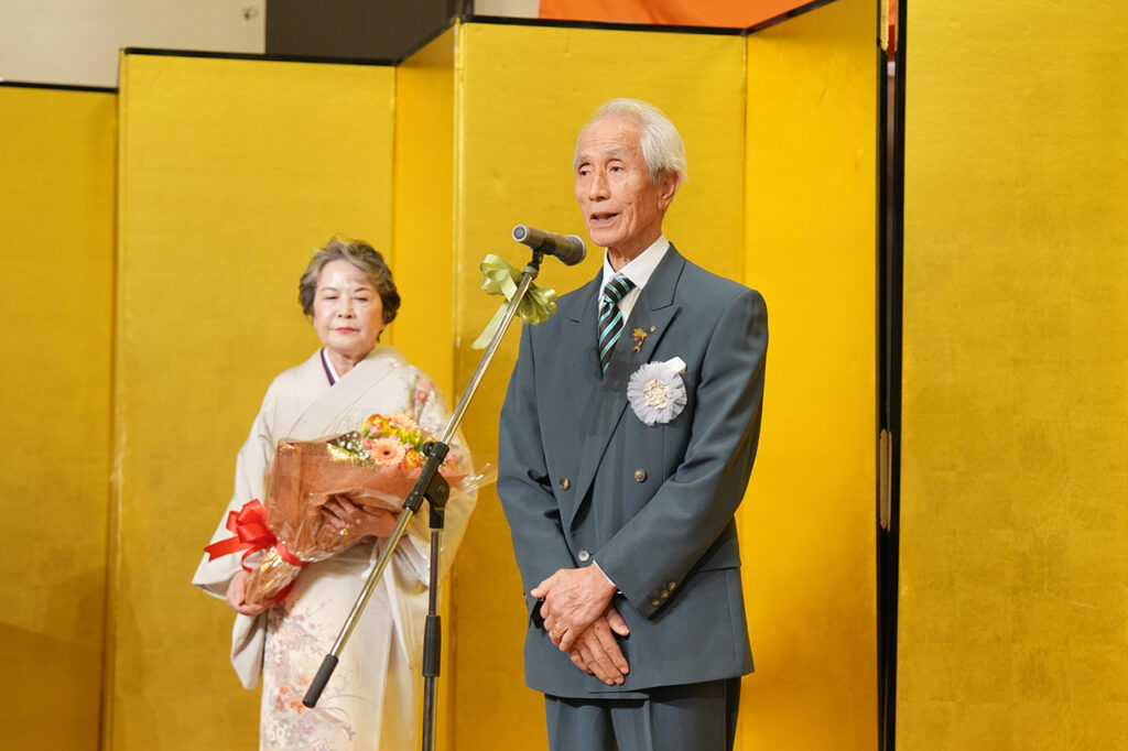 感謝状を贈呈された日本空手道朋城会拳城館最高顧問の藤原純廣先生(隣は夫人の京子様)