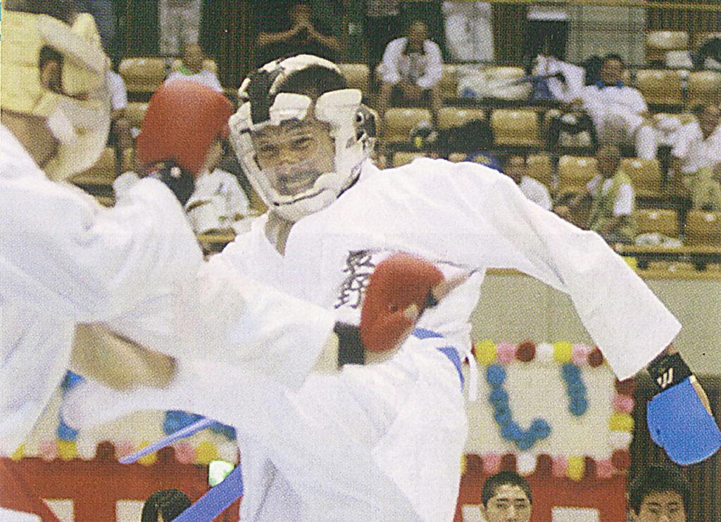 日本スポーツマスターズは、2009年静岡大会男子組手4部で初優勝。得意の上段蹴りを決めての優勝だった