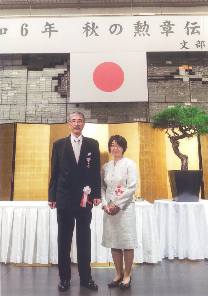 2024年の「秋の叙勲」にて瑞宝双光章を受章した根橋選手。隣は奥様の悦子さん