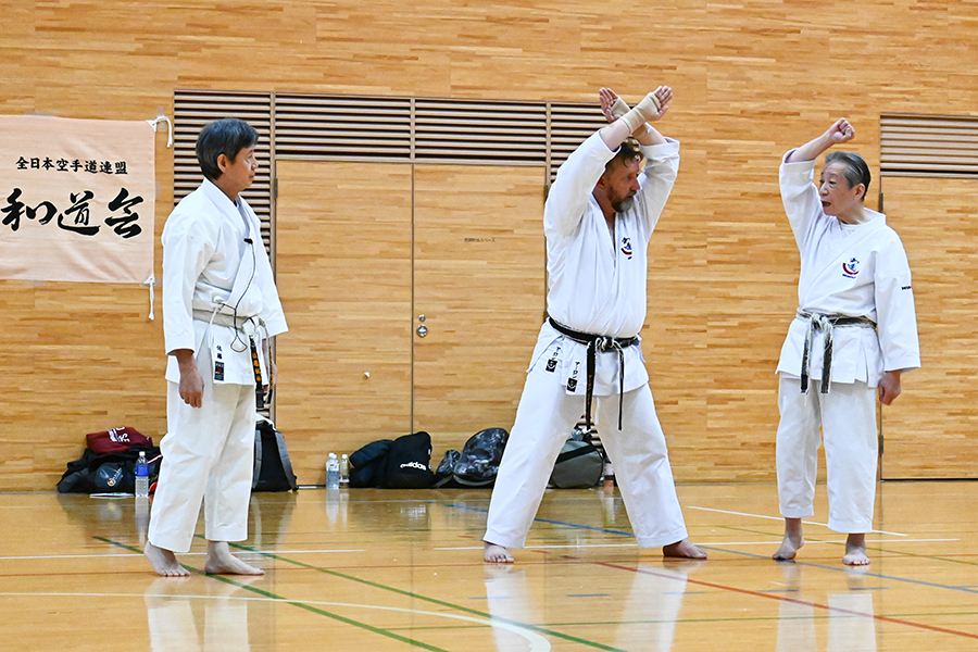 クーシャンクーの手刀による上段受け(指導・志村耕一先生、右)通訳は佐藤誠治先生(左)