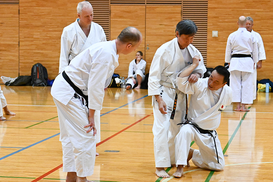 基本組手10本目。相手(の重心を)を崩して投げる(指導・伊藤康夫先生、右)