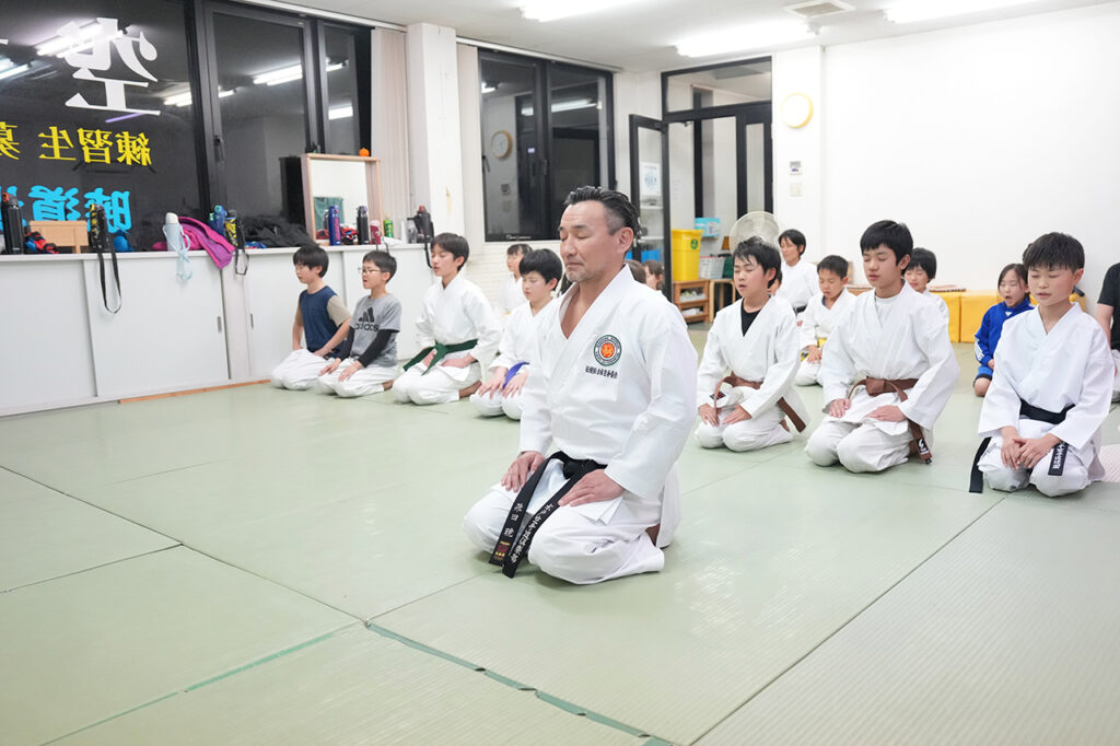 飛田選手と水戸空手道倶楽部 暁道場の皆さん。取材は小学生中心の練習時間に行いました