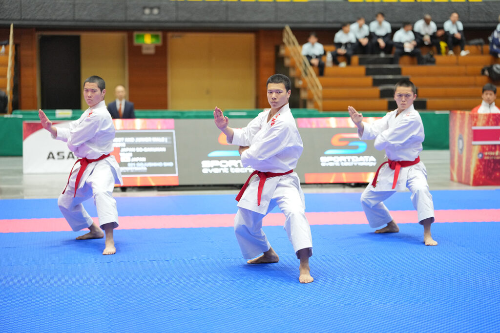 ジュニア男子団体形で優勝の日本の篠原和道・越乢伊吹・小畑旭希(横浜創学館高校)