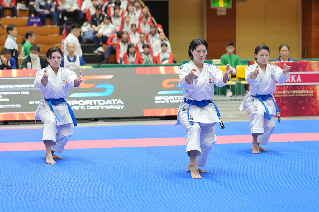 シニア女子団体形で金メダルの佐藤琴美(帝京大学)・岡本祥(帝京大学)・小林実紗(帝京大学)
